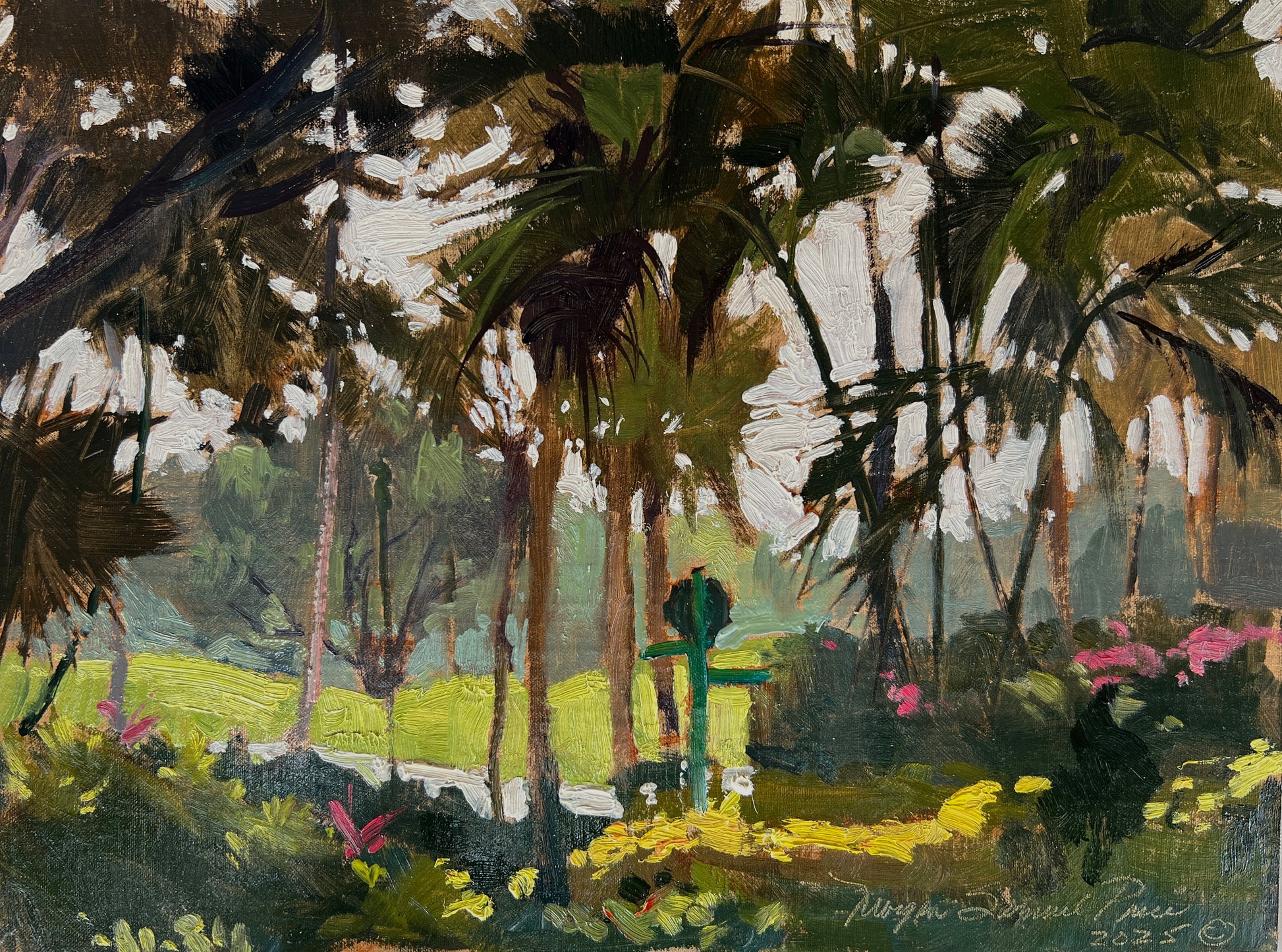 Golfing at Ocean Reef is a delight in any weather. The artist paints from the cool shade of lush tropical palms, their fronds framing sweeping views of the course. No matter where you look, the scenery offers a breathtaking panorama of vibrant greens and coastal beauty.