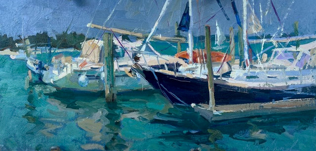 The sailboats rest lightly on the turquoise water, their elegant hulls rocking to the slow rhythm of the tide. Sunlight still glimmers on the ripples, but a hush settles over the harbor as the horizon darkens. Overhead, clouds gather in deepening layers of slate and violet, a silent herald of the storm to come. What was moments ago a tranquil seascape now carries a thrilling tension—an exquisite pause between calm and tempest, when beauty and foreboding share the same breath.