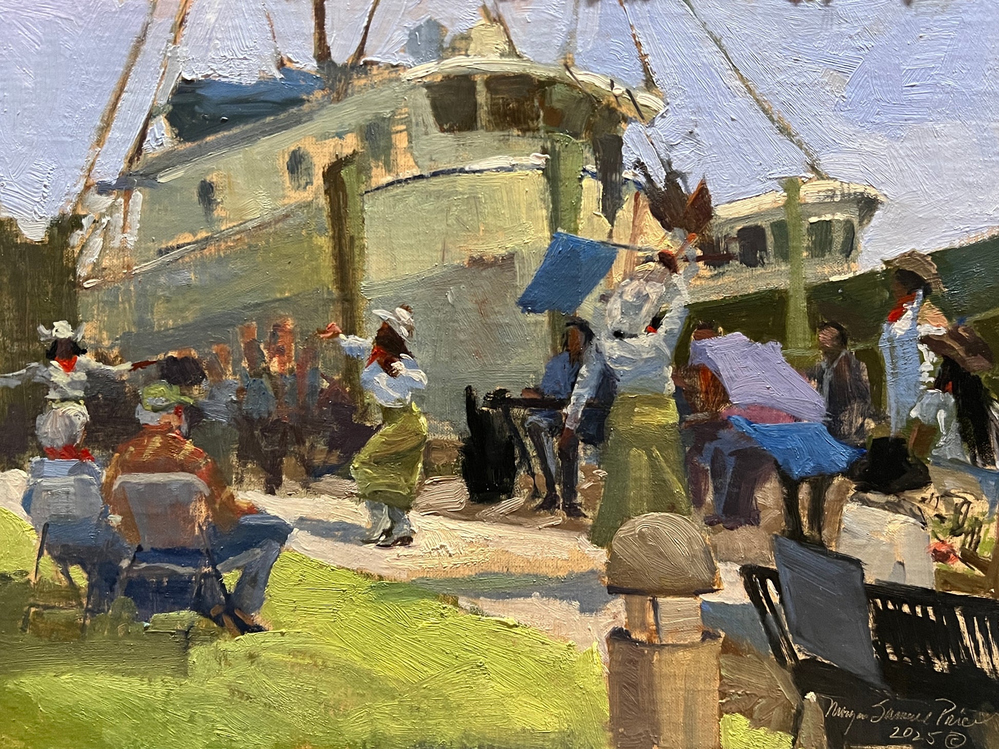 Celebrating Blessings captures a cherished scene that has unfolded for the past twenty years on the Apalachicola, Florida waterfront. During a plein air event on Sunday, singers and dancers gather in joyful reverence, welcoming a visiting artists with a heartfelt service of music, movement, and praise. Set against the rhythm of the water and the spirit of the community, the painting reflects a moment of gratitude, tradition, and shared celebration—where faith, art, and fellowship meet in harmony.
