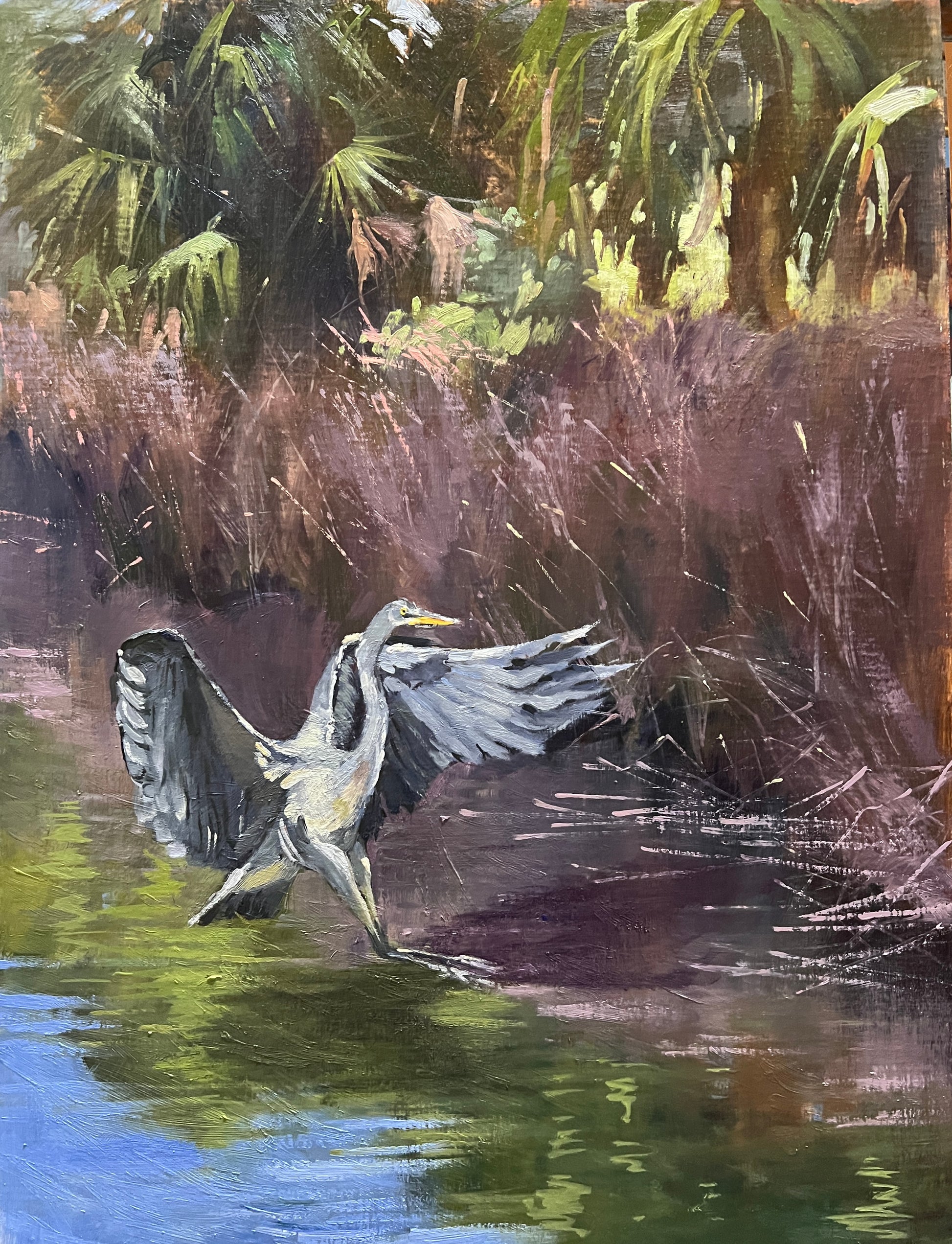 The great blue heron glides in for a gentle landing, wings outstretched against a backdrop of burgundy reeds and sunlit palm trees. Along the bayou’s edge, the bird descends with effortless grace, barely disturbing the water below. In the calm hush of late afternoon, the reflections shimmer on the surface, where even the softest ripple feels reverent, as if nature itself pauses to witness the moment.