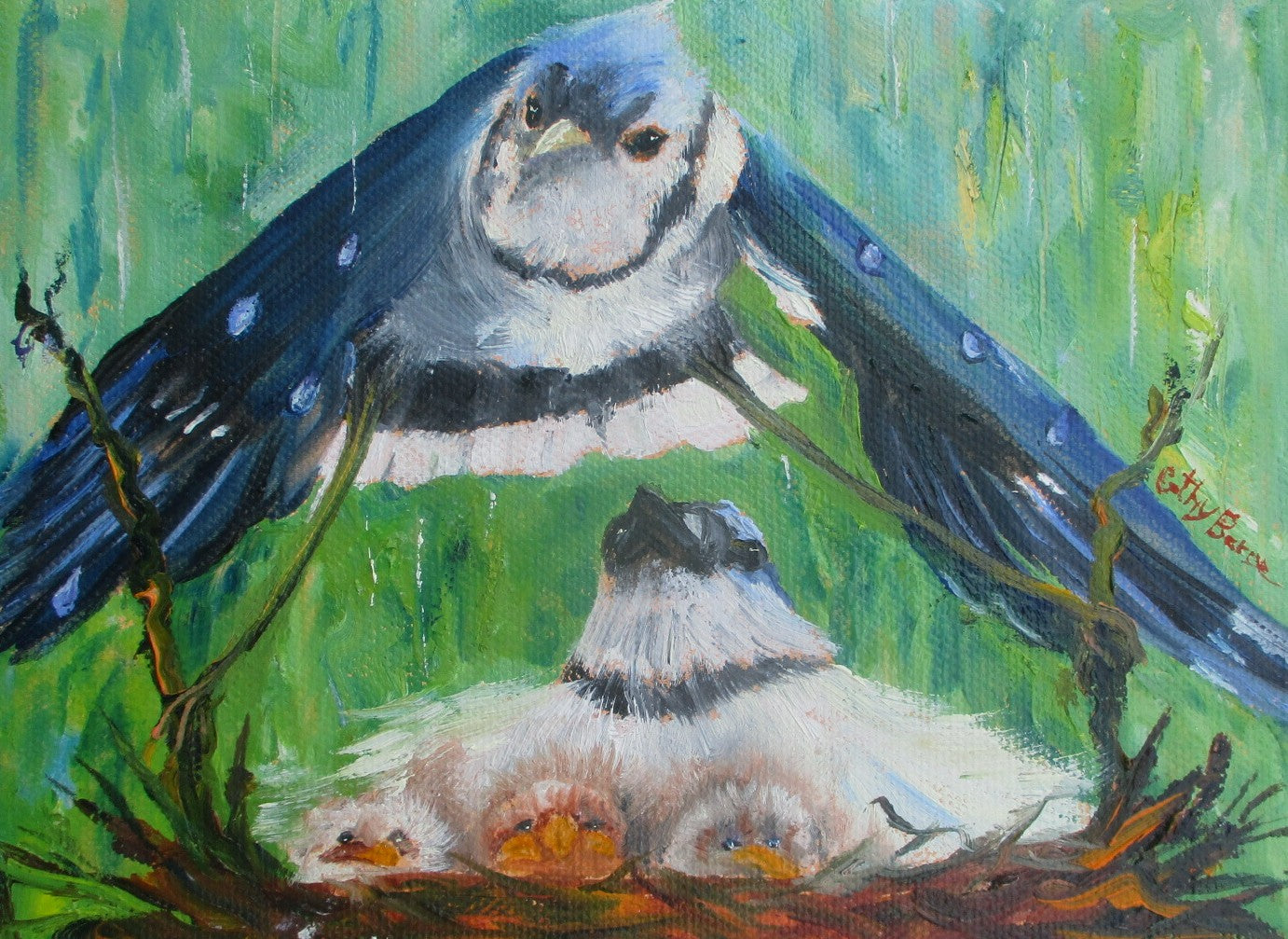 Gotcha Covered, a whimsical oil painting captures a tender family moment in the avian world. A devoted father bird hovers gracefully above the nest, his wings outstretched in a gentle arc that suggests both protection and pride. Below him, the mother bird nestles close to their three fluffy baby birds, who peek up with wide, curious eyes. The nest, delicately woven with twigs and soft grasses, rests securely among branches touched with subtle, playful strokes of color. The entire scene glows with warmth and charm, blending gentle humor with heartfelt affection.