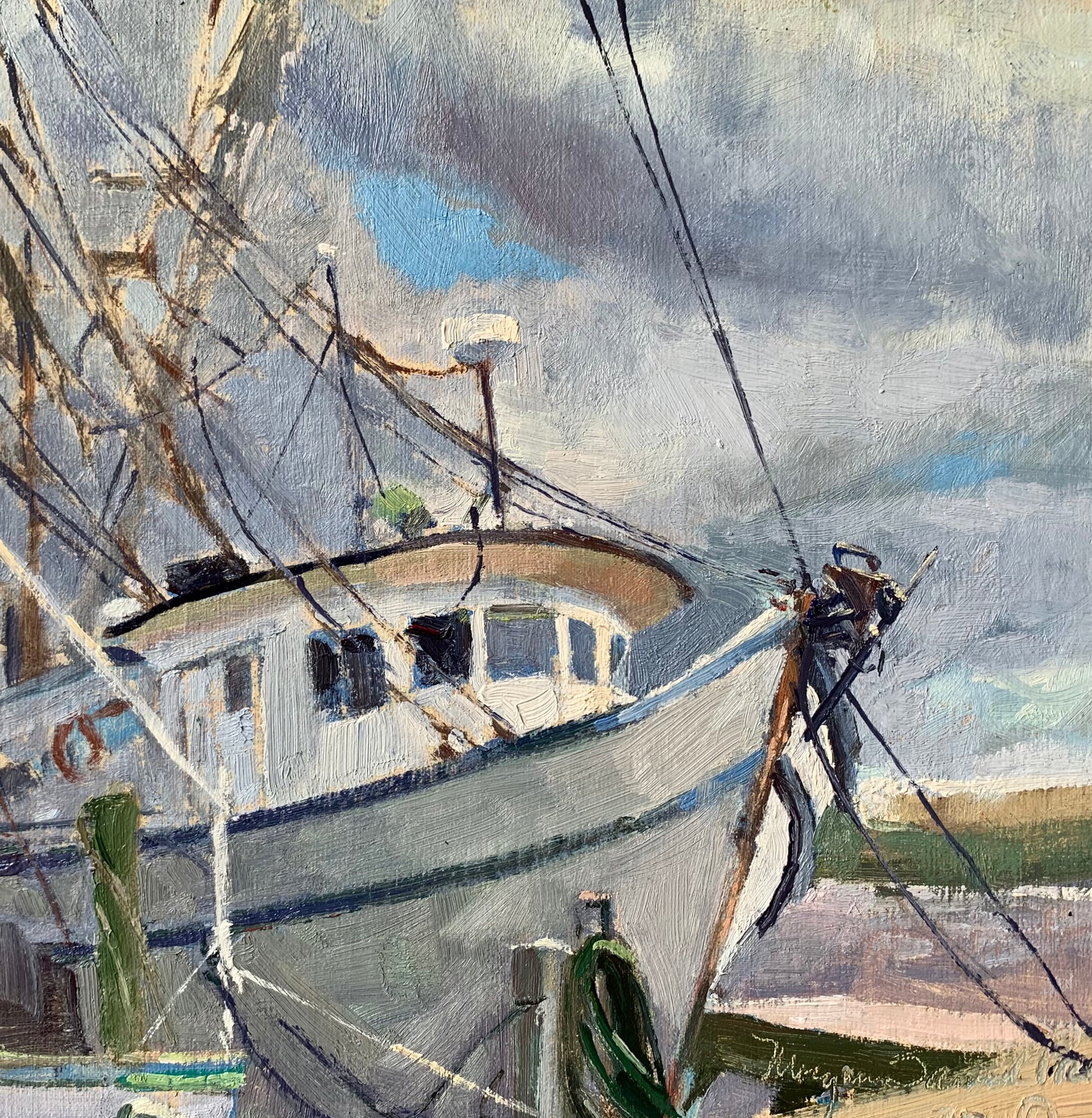 Harbored at Scipio Creek in Apalachicola, Florida, the Lady Elizabeth rests with the quiet confidence of a seasoned shrimping vessel. Her weathered hull and proud lines carry the grace of countless journeys, and—true to her name—she exudes a certain flair. Sunlight glints off her rigging while the gentle tide rocks her in a steady rhythm, a working boat with a touch of elegance, ready for the next day’s catch.