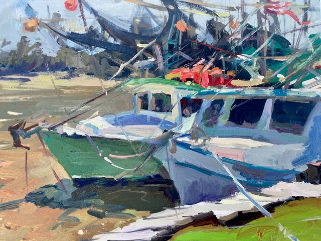 The calligraphic sweep of fishing nets forms a graceful backdrop for the sunlit decks of boats resting peacefully at dockside. Their quiet presence and intricate patterns echo the rhythm of the sea, capturing a moment of calm after the day’s labor.